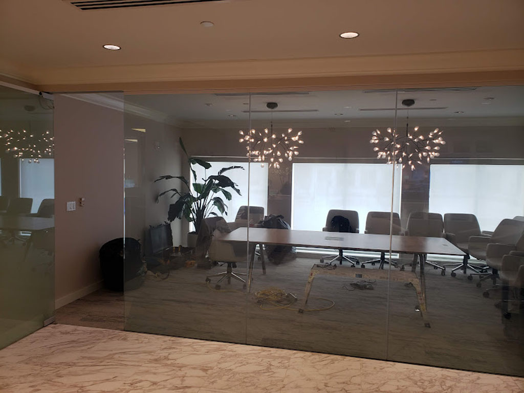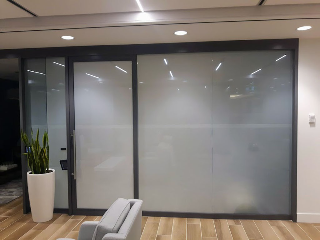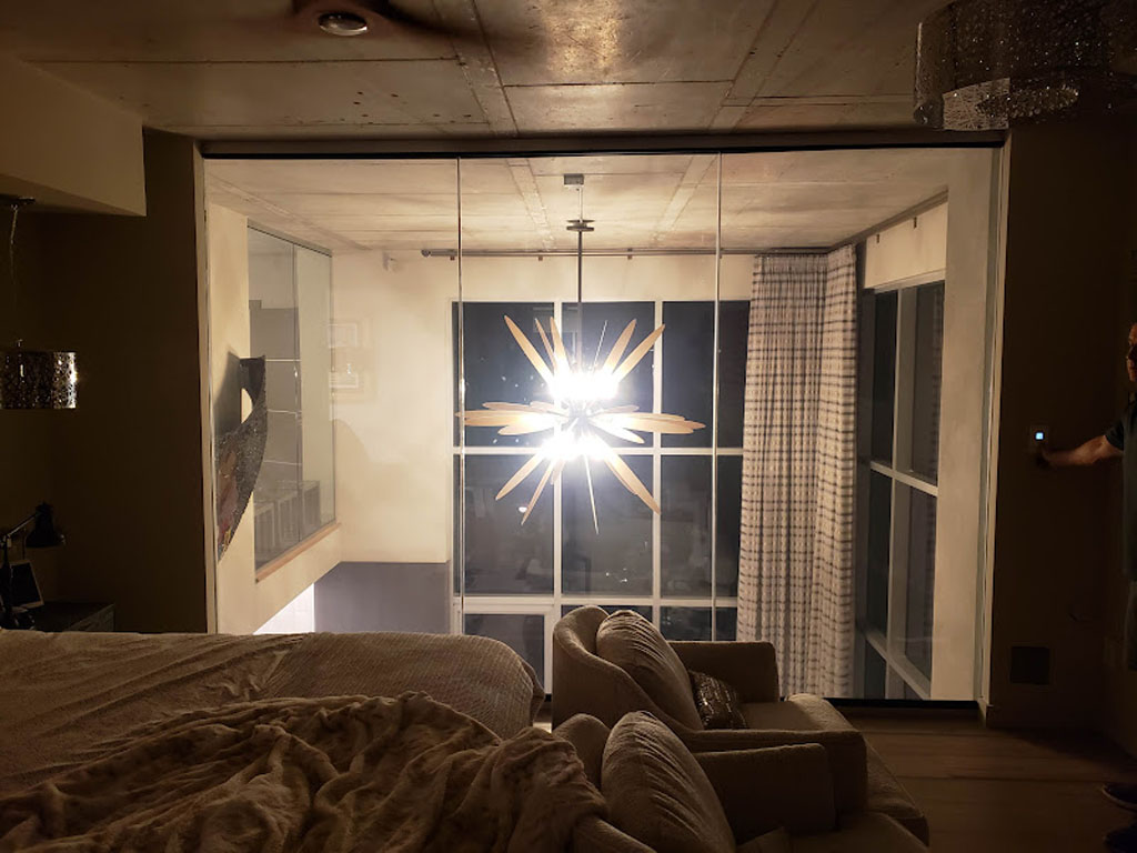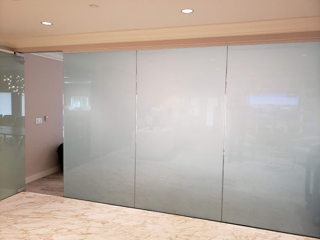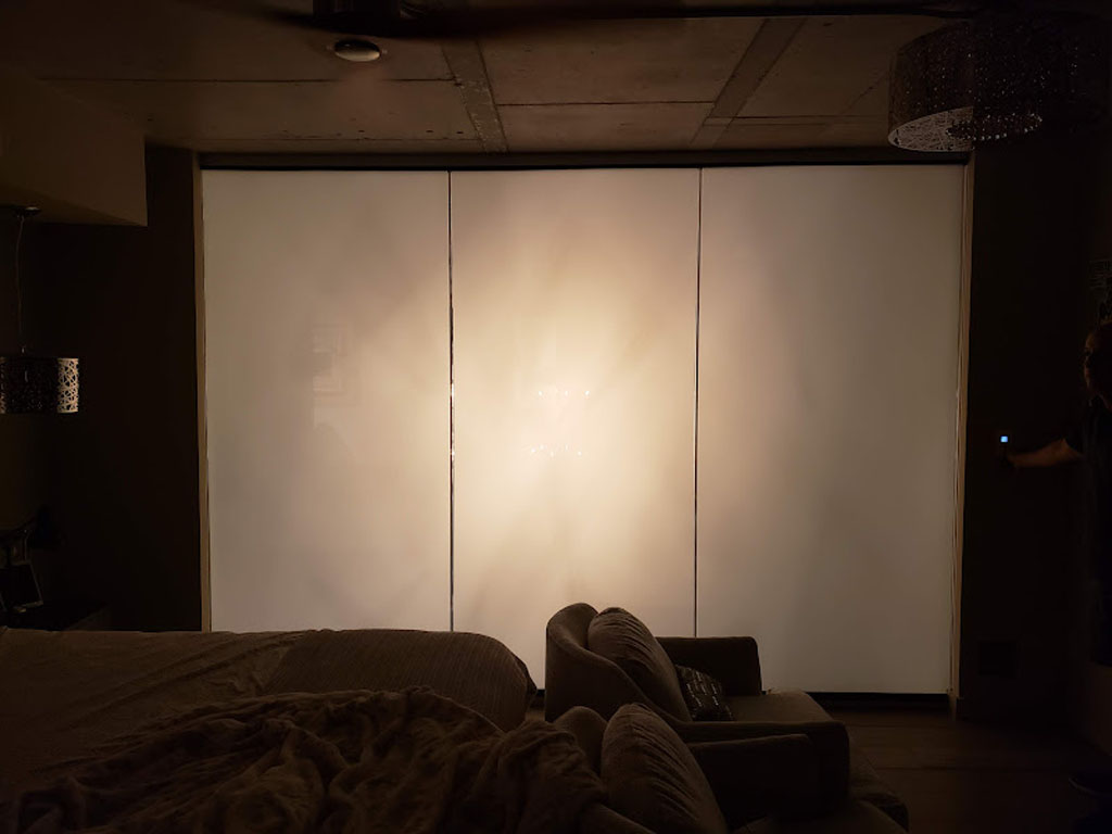 Smart Film toggles from Frosted Film to Clear Film with the touch of a button. The Film is wired to a Low‐Voltage transformer that plugs into a regular AC outlet. Need privacy? In its “Off” state, the film is Frosted/Opaque. Turn it on and the film is clear. A wireless Remote Control lets you control the on and off function without a wired switch.